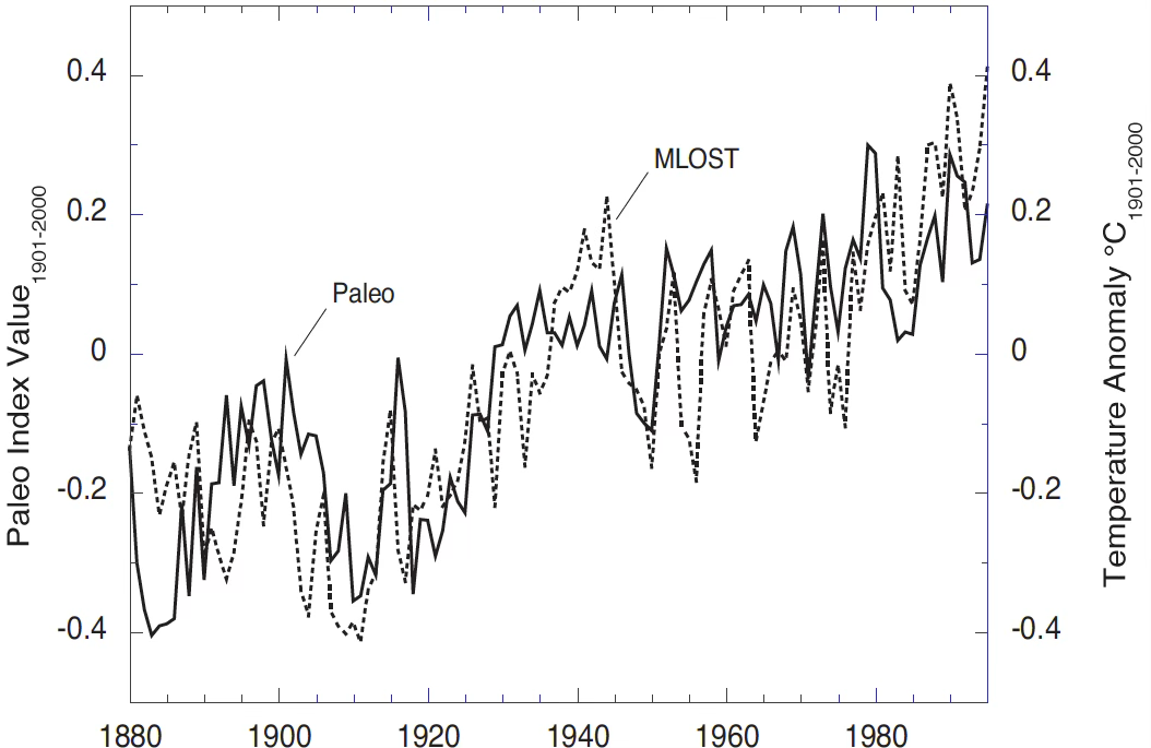 2012年Anderson 等人在GRL上发表了一篇有意思的工作(Anderson et al., 2013),他们选取了173份与全球地表温度存在物理或生物联系的自然记录(代用记录),包括珊瑚、冰芯、洞穴沉积物、湖泊和海洋沉积物以及历史文献等。注意,这些可都不是气象观测站数据。该论文重建了从1730年至1995年的代用温度。这份“古气候指数值”并未转换为温度单位,但考察了其与 NOAA NCDC 的地表温度记录趋势的相关性。发现两者之间存在0.76的强相关性,Anderson得出结论称“仅使用未校准到仪器数据的古气候代用记录,就可以得到 GST(全球地表温度记录)中的变暖趋势的独立证据”。这一自然温度重建增加了对仪器温度记录的信心,同时也为代用记录的有用性和准确性提供了支持。