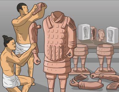 这些古老的士兵皆以赤陶制成,每尊兵马俑都不相同,表情、服装和发型各异。方形底座开始制作,脚和腿部刻有肌肉和骨骼。上半部则用土条一圈圈裹出身体,再将成形的躯干制成理想的形状和大小。头和手臂会分开制作,先将陶土填至模具中,制出大略的形状。成形后,脸部特征和发型则由专业工匠手工雕刻。将陶土士兵的所有组件置于阴凉处约24小时,待其风干硬化。组件硬化后,在躯干和头部刻上盔甲与军装的细节。完成后,便将双手黏至可塑的陶土上。最后要安装的是头部,只要将头部插入躯干空洞处即可。仅须绕着麻袋布制作躯干,再移除麻袋布,即可留下空洞。烧结前,会先在素俑周围挖掘通风孔,再利用窑炉(类似现代的陶器场)将这些陶俑加热至约摄氏1000度。最后,将树漆涂在刚烧结完成的陶俑上,再从有色矿物质,甚至是骨头中取出各种色素与鸡蛋混合,制成覆盖整尊陶俑的颜料。