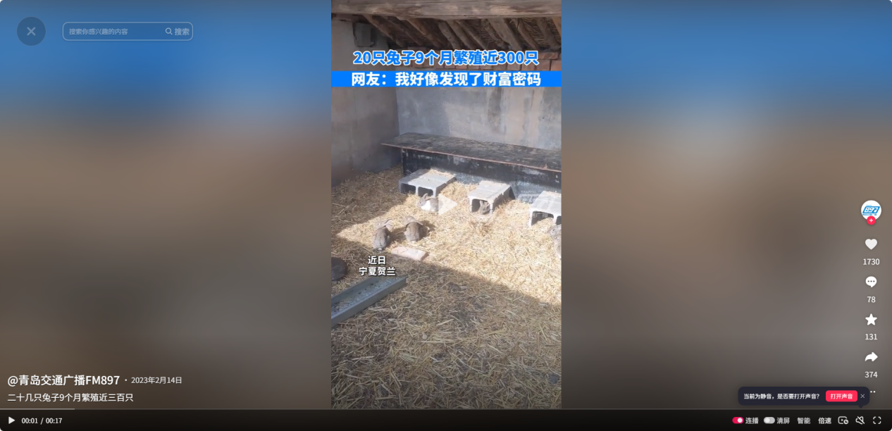 网络上关于兔子繁殖能力的报道其实也不少。比如青岛交通广播在23年发布的视频中称,一网友的20只兔子在九个月的时间里,繁殖近300只!