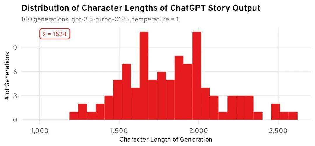 试验一共有三次,第一次是不做字数限制的情况下,AI 生成的故事的平均长度为 1834 个字符。