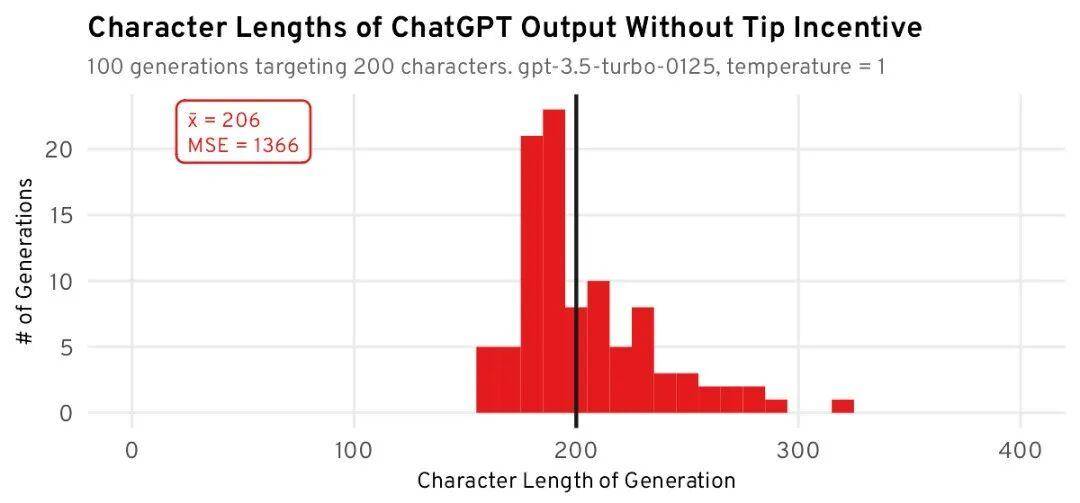 结果显示,ChatGPT 确实遵从了约束,把故事长度压到了 200 左右,但分布并不服从正态,偶尔还会出现很多特别长的回答。