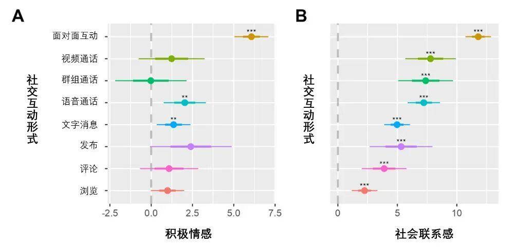 那么,问题来了,是不是只有与亲友面对面相处,才能满足这种归属感?在今天这个网络发达的时代,文字消息、语音通话、视频聊天等线上形式这么方便,能不能起到同样的作用呢?心理学家梁内森及其同事在 2024 年发表的一项研究回答了这个问题。他们将人们日常的社交行为分为八类,包括面对面、视频通话、群组通话、语音通话、文字消息、以及在社交媒体上发帖、评论和单纯浏览,并招募了 249 名参与者,在连续两周内每天多次记录他们过去一小时的社交互动和情绪状态,最后收集到了近 7000 条数据。结果发现,面对面互动在提升积极情绪的效果上远高于任何虚拟社交方式,虽然视频和语音通话也能一定程度上增强社会联系感,但也比不上面对面互动的效果。而最不好的就是只浏览和评论别人发表的内容,不仅感受不到多少的快乐,还可能会让人感到孤独。[3]图源:参考文献[3]