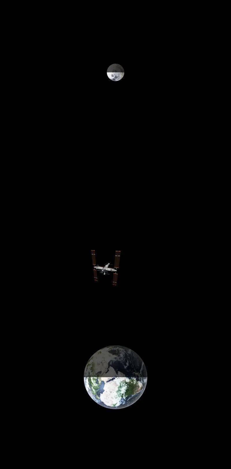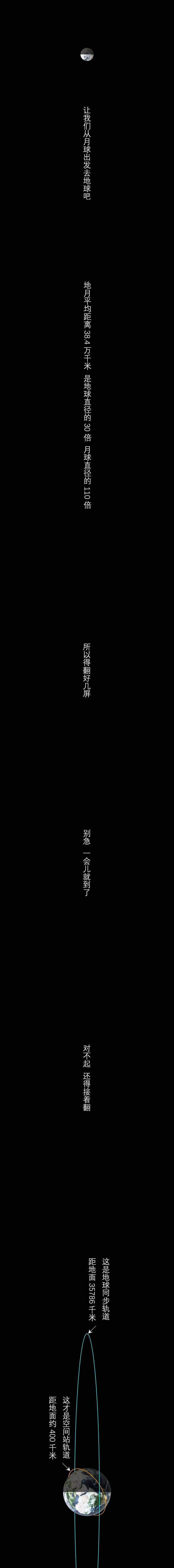 地球、月球和空间站快捷印象。图片来源:作者自绘如果按这个图来理解,那么随着空间站围绕地球运行,它理应拥有非常广阔的活动空间和灵活多变的视角,可以看到地球上看不到的一些月球侧背面。然而这三者的实际位置关系是怎样的呢?我们改用真实世界的比例来感受一下(长图警告):
