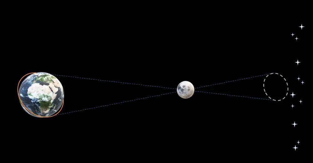 前文说“空间站和地面上的望月视角基本相同”,有没有不那么“基本”的、足以让航天员留意到的现象呢?还是有的。举起一根手指,分别闭上左眼和右眼去看它,会发现它在背景中位置有变,这也是立体感的成因。世界各地的人,由于所在地点不同,同一时刻看到的月球在星空背景中的方位也有差异。从地球这头到那头,各自看到的月球方位,在同一星空背景中能够相差 2°——这个数字可不小,要知道月亮在天上也只占 0.5°。但只要你不跟地球另一头的朋友认真拍照对比,就难以体会这个差异。同一时刻不同地点所见的月球在星空中位置有异。图片来源:作者制图,Stellarium 模拟星空但是空间站就不一样了,它只用 45 分钟就能从地球这头飞到那头,所以能够主动制造显著的视角差异。在这 45 分钟里,看着月亮在璀璨的星空中缓缓漂移 3、4 个自身大小,这个场面颇具立体感,呆在地面一处赏月的人是无法感受到的。