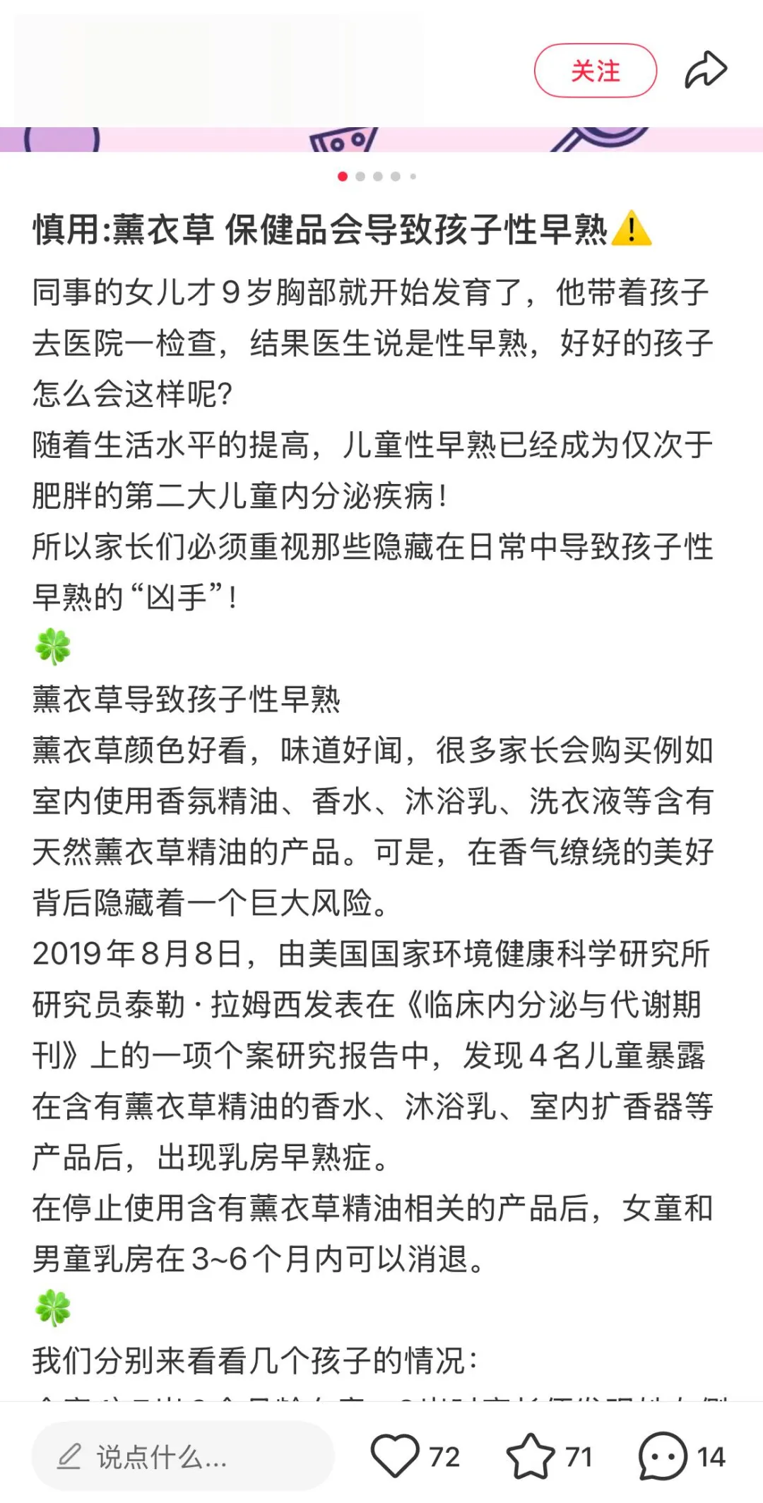 薰衣草颜色好看、味道好闻,很多人都喜欢用带薰衣草精油的产品。但是,最近一位博主的帖子,却引起了很多有小朋友的家长的担忧: