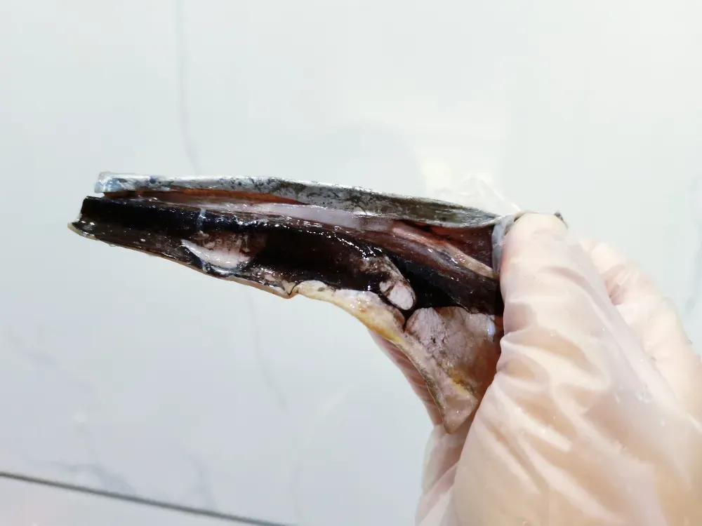 其次,撕掉腹腔内的黑膜,这也是腥味的主要来源。