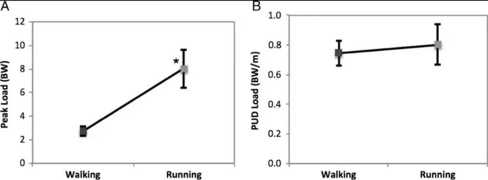 之所以会有“跑步伤膝盖”这样的观点原因也很好理解。在跑步的时候,膝盖会承受比平时更大的冲击力,磨损当然也会更严重了。其实这样的观点只说对了一半。首先可以肯定的是,在跑步时膝关节会承受的最大冲击力确实比走路时候更高。比如,2014 年的一项研究就发现,在跑步时候,膝盖所承受的峰值冲击力最大可以达到 8.02 倍体重,而相比之下,走路时候膝盖承受的峰值冲击力最大是 2.72 倍体重。跑步时候膝盖要承受的峰值冲击力几乎是走路时候的 3 倍(如下图左侧图所示)。但这项研究还发现,因为跑步的速度比走路快很多,步幅也比较大,在整个运动过程中膝关节会有更多的腾空时间,在这期间膝盖承受的力非常小。所以如果考虑整个运动过程,在单位距离上,跑步时候膝盖承受的冲击并没有比走路大出多少(下图右侧所示)。跑步和走路膝盖的峰值冲击力和单位距离负荷,图片来源:参考文献1