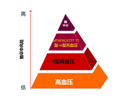 MTHFR基因是叶酸-甲硫氨酸代谢途径中的关键酶,其编码的基因MTHFR的677位点容易发生突变,存在3种基因型:CC型、CT型、TT型。其中,MTHFR 677TT基因型在中国人群出现的概率高达25%,而该基因型的H型高血压患者,脑卒中的发病率更高。