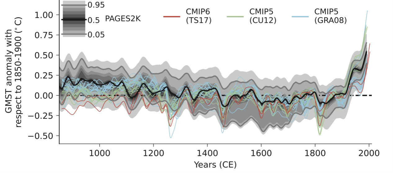 2013年发表在Science上的一篇文章(Marcott et al., 2013),把对地球过去温度的重建序列延伸到11300年前,结果揭示,地球在全新世早期(10000至5000年前)的经历温暖期之后,在全新世中期到晚期(<5000年前)冷却了~0.7°C,在大约200年前的小冰河时代达到全新世最冷的温度。在过去的一个世纪里,我们星球变暖的速度比上一个冰河时代结束以来的任何时候都要快。