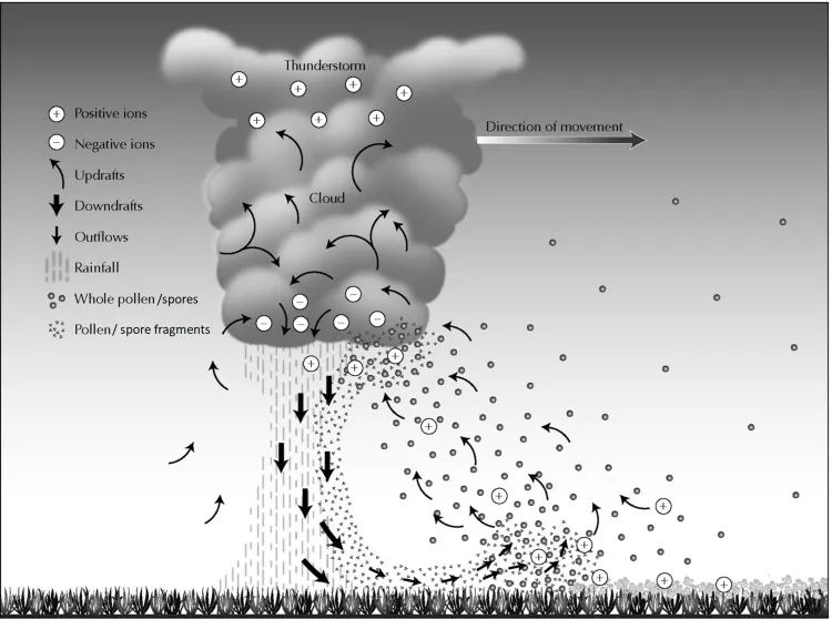 当雷暴天气来临时,强风会将地面的花粉、霉菌等过敏原卷入高空。在雷暴的强气流和积雨云高湿度环境下,花粉颗粒会吸收水分膨胀、破裂,分解成直径仅2~3微米的亚花粉颗粒——这个粒径恰好能轻松穿透人体鼻腔和咽喉,直接进入下呼吸道。随后,降雨会将这些微小颗粒重新带回地面,导致空气中可吸入过敏原浓度急剧升高。