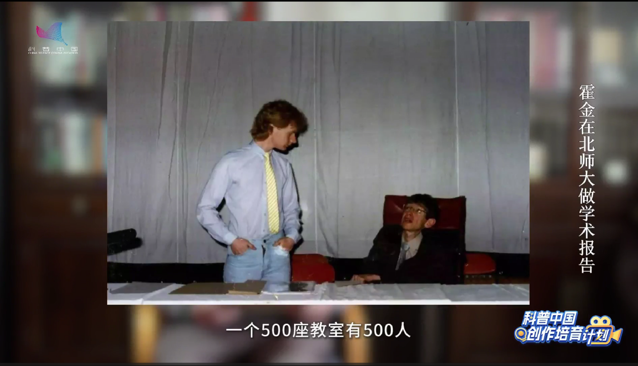 当时呢,中科大那方面跟霍金有一些交往。有交往的时候呢,霍金就流露出一个意思,他想访问中国啊,特别想上长城。这时候呢,中科大就由他的副校长钱林照先生(钱照先生是英国皇家学会的会员,就是英国的院士)写了一封信给英国皇家学会,于是呢,英国方面就答应了霍金访问合肥。霍金在中科大进行了学术交流,也做了一些科普讲座。做完以后呢,因为霍金想去长城,长城在北京去才比较好啊。我的老师刘辽先生跟中科大那些教授关系比较好,他们就问刘先生说你们可不可以接待一下霍金,我们这在霍金来中国之前就已经在做这件事情了。结果我们这个团队提出报告以后呢,学校和上边教育部这边都同意了。霍金就在访问中科大以后来了北师大,在北师大做了一次科普演讲。有一个五百座的教室,有五百人挤得水泄不通,我也参加了,那时候我还出国前夕啊,也参加了。完了以后呢,我们在外边,郭靖那又跟一些人照了一个相,我们也没有特别保存。这个地方呢,有一张相保存下来的,郭靖后面的两个人,一个是我在,再有一个是现在清华大学的刘斌教授。刘斌呢,原来是中国自然科学史研究所的研究员,他是研究自然科学史的。霍金在外边休息的时候呢,他拉着我,我们俩人在那背后呢,就照了一张相,这张像是我手头保存的唯一的一张相片,非正式的,就是在北师大的这个物理楼的外边。后来还有一张照片是他在长城上拍的,伞兵老师陪他去的,但是那张照片上只有梁伞兵老师的一个背影。