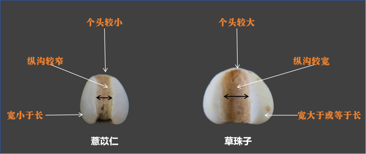 l 薏苡仁(细长型):个头较小,纵沟较窄,宽小于长。
