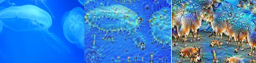 如果训练了一个能识别狗的神经网络。当它看到一张云朵的照片时,某些神经元可能会微弱地激活,因为云朵的某个边缘曲线恰好和狗耳朵的特征有那么一点相似。接着,算法会计算网络某一层神经元的激活强度,然后通过梯度上升来修改输入图像,也就是让这些神经元激活得更强烈。这个过程不断迭代更新:神经元越激活,图像就越被修改成能激活这些神经元的样子;图像越修改,神经元就越兴奋。这形成了一个正反馈循环——云朵里那一丝狗耳朵的影子被放大,然后是狗的眼睛,接着整只狗的轮廓都浮现出来了。