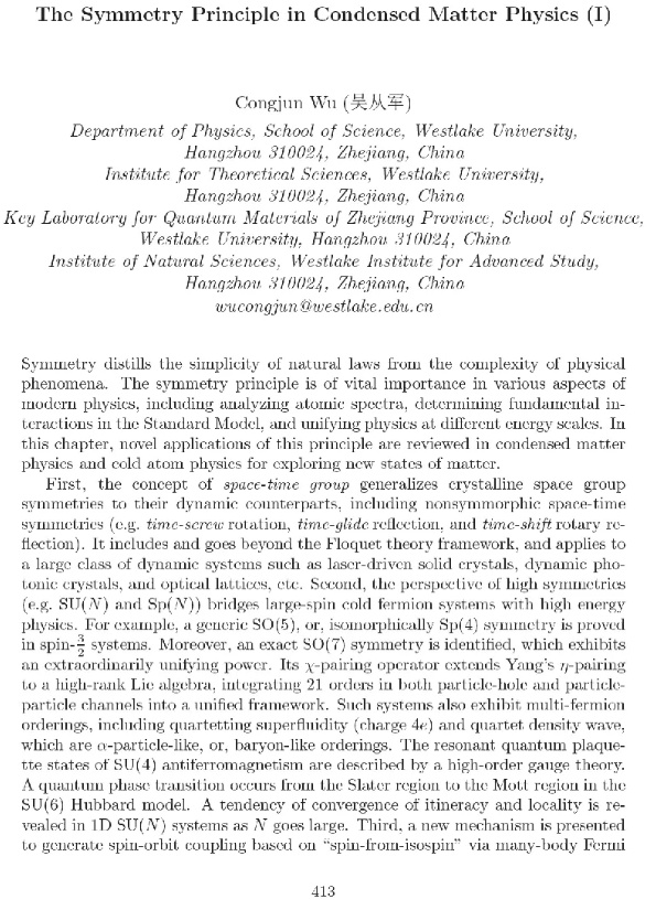 在杨先生百岁寿辰时,应朱邦芬老师的邀请,我写了篇在凝聚态物理中对称性原理的综述,其中一部分就是从高对称性来研究超冷原子物理。这篇文章被收录在A Festschrift in Honor of the C N Yang Centenary, Scientific Papers一书中。我在《杨振宁先生代表作导读》中也提到了η配对的SO(7)推广,以此向杨先生致敬。