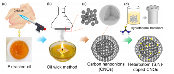 全球每年产生数百万吨的禽类加工废料,其中鸡肉脂肪占据相当比例。传统处理方式要么填埋,要么低价值利用,造成资源浪费和环境负担。而去年,《ACS Applied Materials & Interfaces》上的一篇文章为鸡油进行了正名。不是它的营养价值,而是因为它能变身为高性能储能材料——碳纳米洋葱。