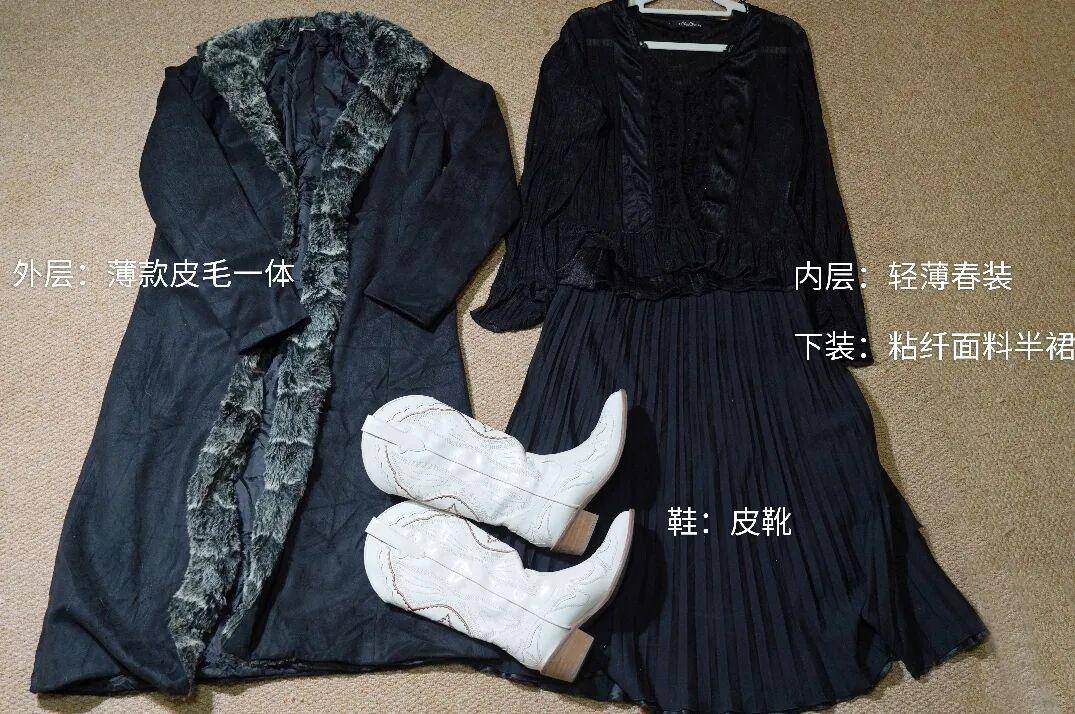 女士:长款羊毛大衣+超薄款羽绒服(充绒量30g左右)+长袖春装(只要材质合适,什么都行)