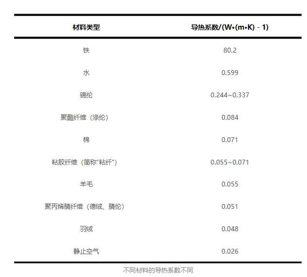 因此保暖的本质,就是减少人体本身热量向环境的散失。而最好的方法,就是往身上包裹一些传导热量速度比较慢的东西。那怎么看物质传递热量的速度呢?