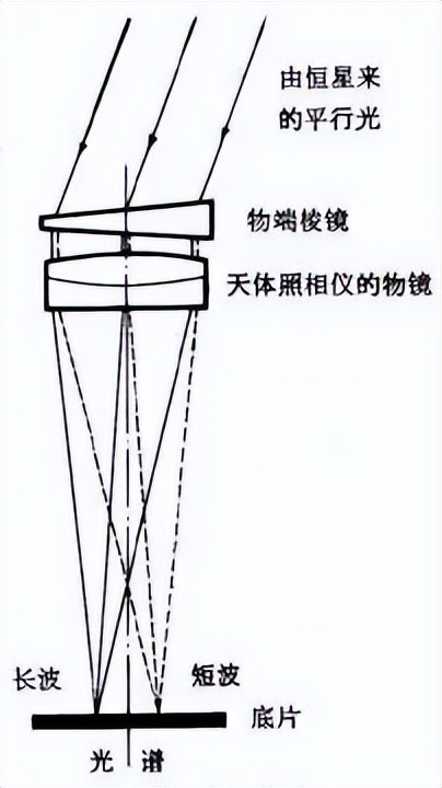 1885年,皮克林首次将“物端棱镜法”与天文照相术结合。物端棱镜法将顶角较小的棱镜横着放置在物镜前方,用以分解星光。