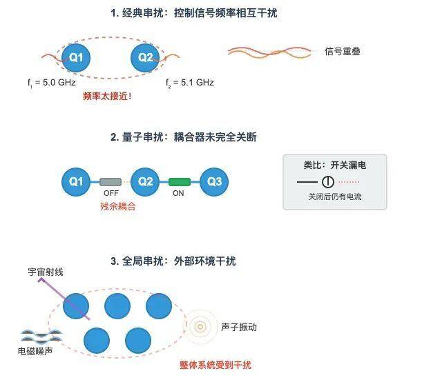 · 经典串扰:量子比特的控制信号的频率靠的太近,导致控制相互干扰。(频率指的是波每秒完成的周期数。在量子计算中,每个量子比特通过不同频率的微波信号进行控制,从而实现精确的操作和调控)