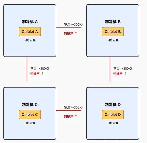 图 4 Chiplet跨稀释制冷机互联会引入额外热噪声,需要注意的是,实际的互联拓扑并不一定是相邻 Chiplet 两两直接连接。图中所示的相邻互联方式仅用于演示。