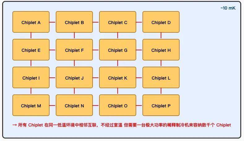 这种“低温 ↔ 室温 ↔ 低温”的信号传输路径会引入较大的热负载和噪声,从而破坏量子比特的状态。如果所有 Chiplet 都放在同一台稀释制冷机里,那我们就需要一台功率极其庞大的稀释制冷机来容纳数千个 Chiplet,而制造这样的大规模稀释制冷机本身就是全新的挑战。