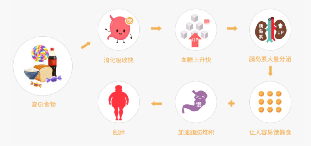 简单来说,GI 值越高的食物,进入肠胃后消化越快,吸收越完全,葡萄糖释放得越快,导致血糖迅速升高。