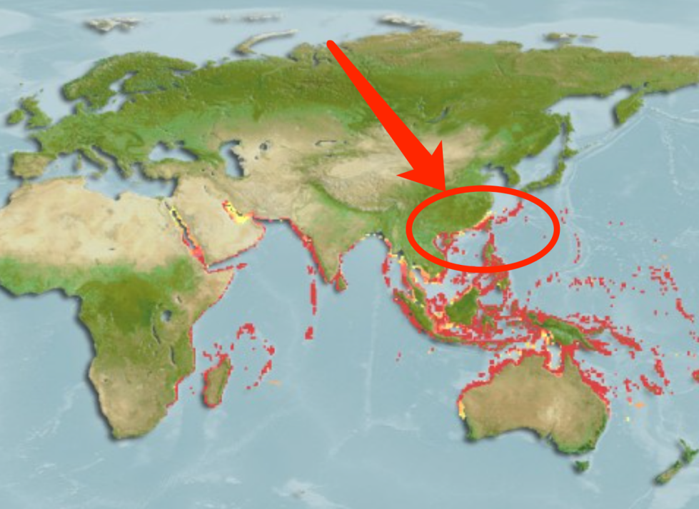 玫瑰毒鲉的分布,在我们国家南方也能见到。图片来源:fishbase