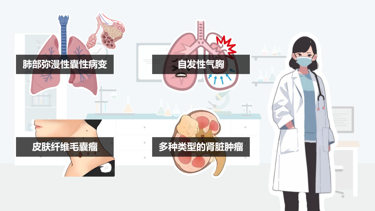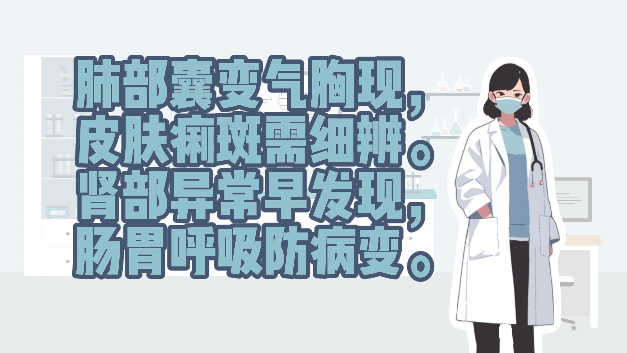 这种病有哪些临床表现呢?有几句简单的口诀可加强记忆:“肺部囊变气胸现,皮肤粒斑需细辨。肾部异常早发现,肠胃呼吸防病变。”