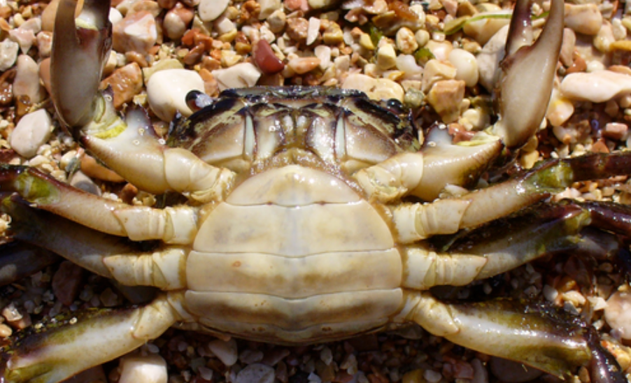 螃蟹的腹部很短,而且紧紧贴在它们坚硬的头胸部的下面,就是我们平时吃螃蟹时候用来区分公母的那个圆形或者三角形的区域。