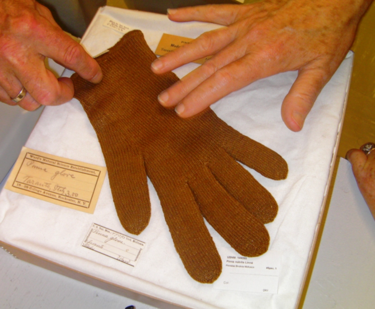 但你可能不知道,这个手套的材质非同一般,它是用贝壳的“胡子”编织成的。