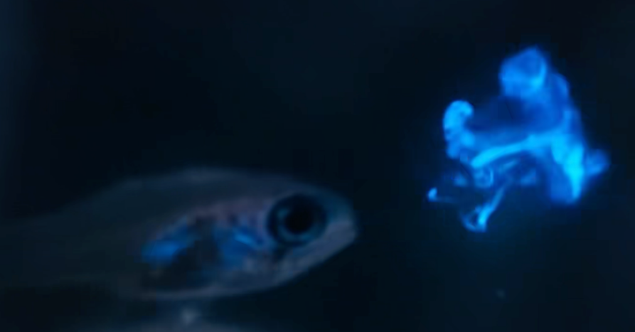 这个荧光的强度能够把天竺鲷半透明的腹部照亮。