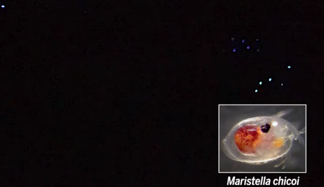 暗色天竺鲷的食物是体型更小的浮游动物,绝大部分浮游动物没有“还手之力”,只能任凭天竺鲷吃掉自己。但在这些浮游动物中,有一类能用自己的方式反抗暗色天竺鲷,它们就是能够发光介形虫。