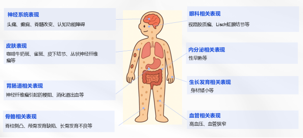 神经纤维瘤病累及全身各个系统,类型不同症状也不同,主要表现为皮肤牛奶咖啡斑、腋窝雀斑,以及神经纤维瘤伴发肿瘤压迫、侵蚀周围结构出现的神经系统及内脏系统症状和体征。