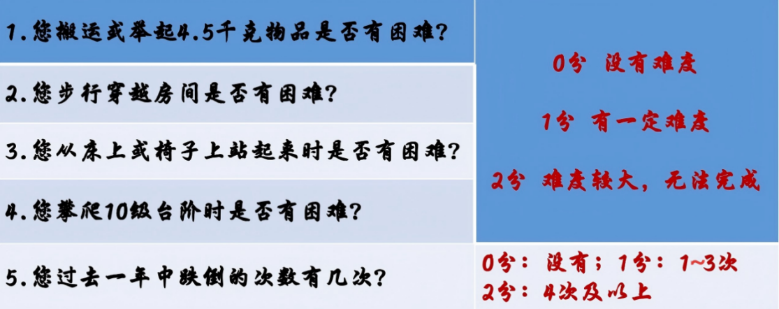 当总分<4分,说明老年人的状态基本正常;当总分≥4分时,提示存在肌少症的风险,应尽快前往医院接受专业诊断。