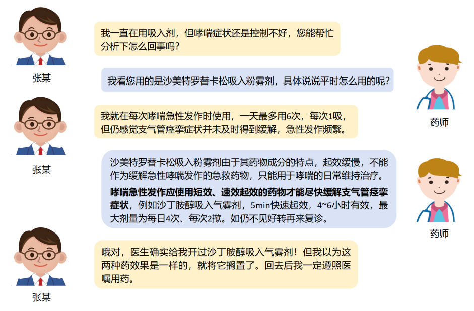 一位去年新确诊哮喘的年轻患者张某来咳喘药学门诊就诊。
