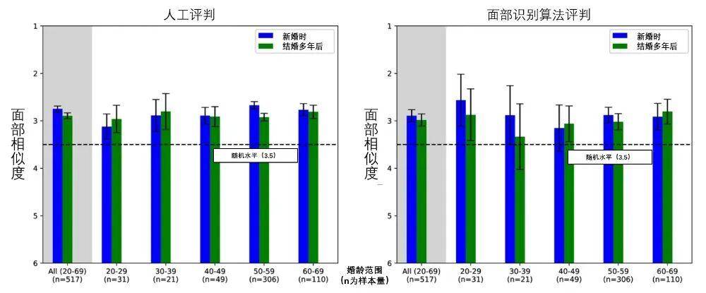 人工和算法评判的结果几乎一致地发现,所谓的夫妻相确实存在,无论是新婚时期还是结婚多年后,夫妻的面部特征都比随机水平更加相似。但是,这些夫妻在结婚几十年后的相似度,还是与新婚时差不多,甚至有些夫妻的面部相似性在多年后还有轻微的下降。[2