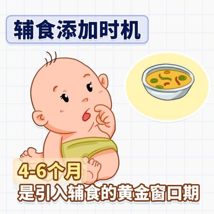 辅食添加的最佳时机,4-6个月是引入辅食的黄金窗口期,不建议早于4个月添加辅食,也不应晚于6个月开始。