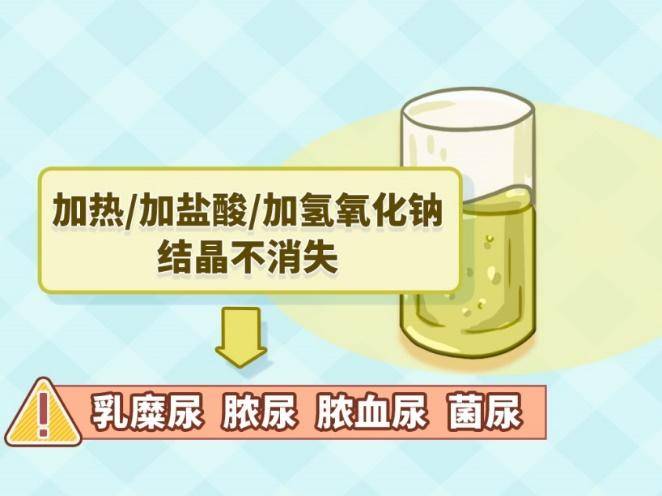 通过加热、加盐酸或氢氧化钠,上述结晶就会消失。如果经过上述处理,结晶没有消失,考虑病理情况,如乳糜尿、脓尿、脓血尿、菌尿等。