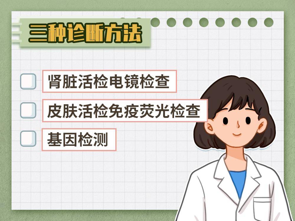Alport综合征的诊断需要结合临床表现和专科检查,诊断应由简到繁,对于有家族史或疑似患者,首先进行晨尿离心检查。若发现持续血尿或蛋白尿,再进一步进行专科检查。主要有三种诊断方法。