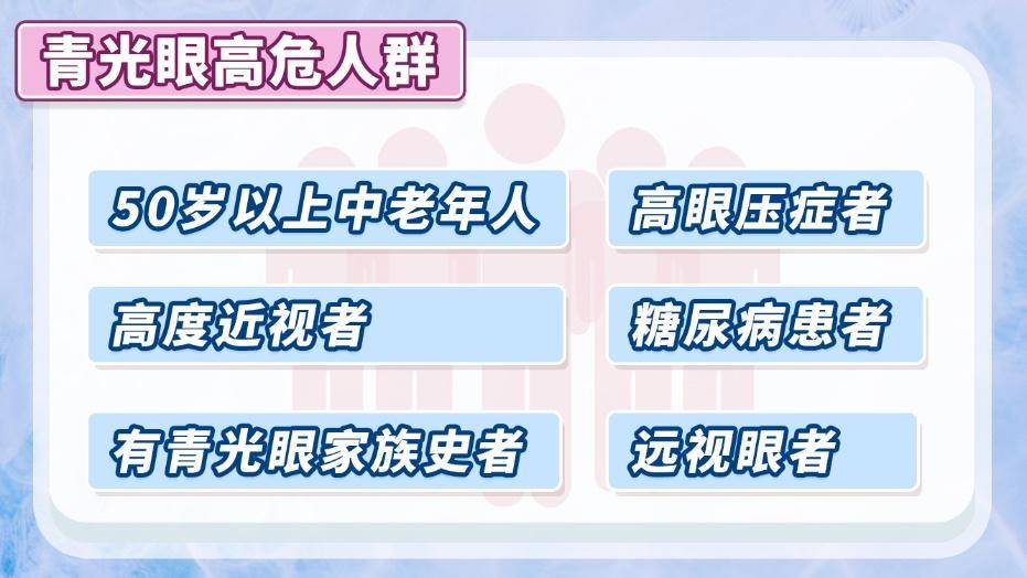 为了早期发现青光眼,应当对危险人群进行筛查。青光眼的危险人群主要包括:
