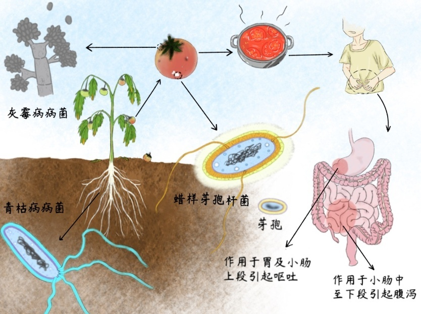 当携带蜡样芽孢杆菌的番茄未经充分加热就被端上餐桌,被误食后,细菌产生的肠毒素和呕吐毒素引发中毒,在胃肠道里“兴风作浪”:作用于胃及小肠上段时就引发呕吐;作用于小肠中下段时就会导致腹泻。神奇的一幕表现为前一刻还在大快朵颐,下一刻一路狂奔、上吐下泻。