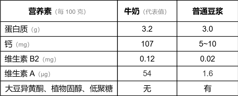 根据《中国食物成分表》(标准版)[2][3]的数据,我们对比纯牛奶和普通豆浆(以大豆与水 1:10 比例计算)的关键营养素。