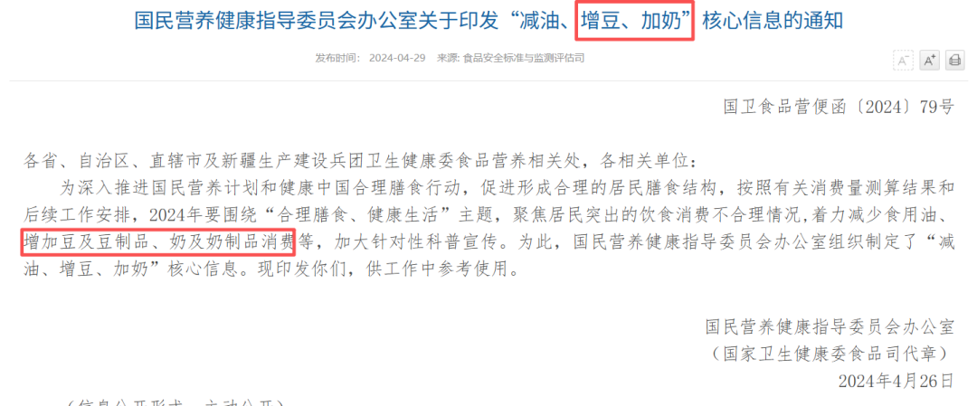 [5]国民营养健康指导委员会办公室. 关于印发"减油、增豆、加奶"核心信息的通知(国卫食品营便函〔2024〕79号)[Z].北京: 食品安全标准与监测评估司, 2024-04-29.