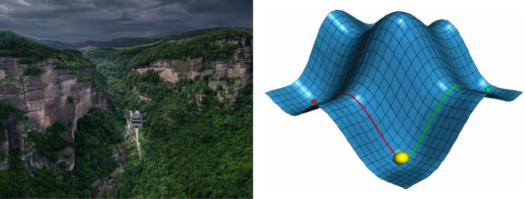 图1.自然环境(左)与假想分子体系(右)的势能面