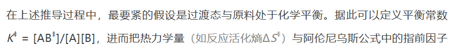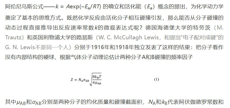 玻尔兹曼常数。考虑到真实分子有复杂的形状,且化学反应对分子碰撞的角度有一定的要求,故定义方位因子ρ,使得阿伦尼乌斯公式中的指前因子A = ρZ。碰撞理论的处理手法虽然足够简明和直观,但是缺点也十分明显:用硬球和方位因子概括分子的结构难免失之粗糙;化学键形成和断裂过程所蕴含的能量变化也无法用硬球碰撞的机械能完全模拟。这当然不能责怪特劳茨和路易斯,因为人类对分子结构的深入理解,还得依赖差不多十年后才诞生的量子力学。