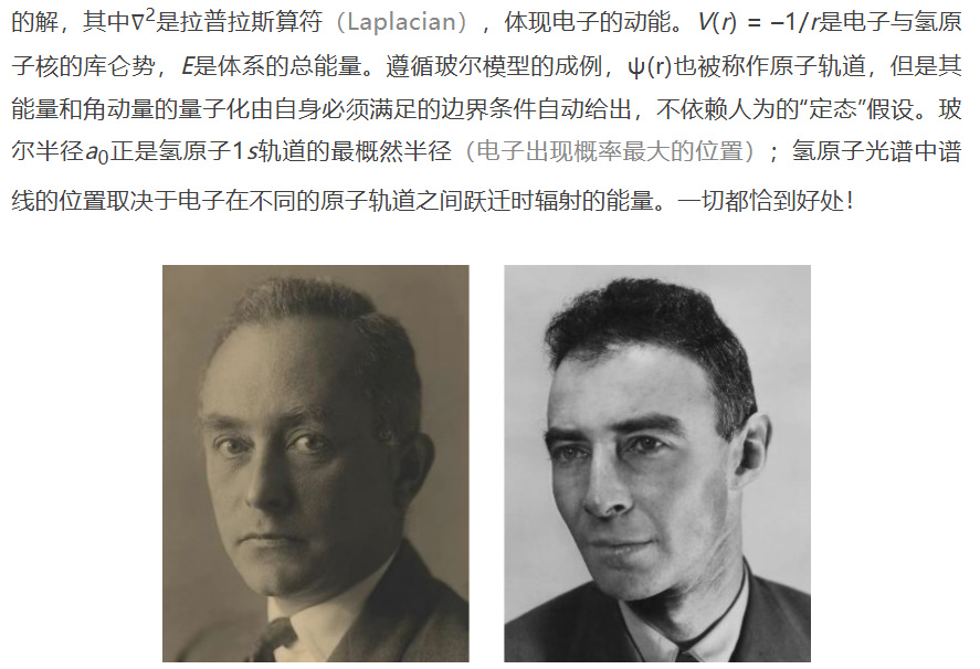 中的能量量子化条件建筑在人为假设的“定态”(电子在特定圆轨道上运行时不会按照经典电动力学的要求辐射能量)基础之上,是一个不太“自然”的结果。直到1926年,奥地利物理学家薛定谔(E. Schrödinger)创立波动力学,才完整地解决了氢原子的结构和光谱问题。在波动力学的世界里,电子的运动不再被束缚在圆轨道中,而是用波函数ψ(r)来描述(r是以氢原子核为原点的电子坐标)。ψ(r)是电子薛定谔方程(采用原子单位制)