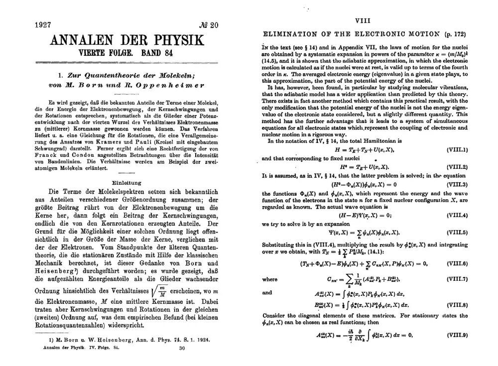 在玻恩和奥本海默两人波澜壮阔的科学生涯中,B–O近似实在算不上一朵夺目的浪花。玻恩是“量子力学”(德语Quantenmechanik)一词的发明者,主导创立了矩阵力学。他在哥廷根大学的一众学生和助手,如约当(E. Jordan)、海森堡(W. Heisenberg)、泡利(W. Pauli)和洪特(F. Hund)等,对量子力学的建立和拓展做出了卓越的贡献。玻恩本人因为对波函数的统计诠释获得了1954年诺贝尔物理学奖。奥本海默从欧洲学成归国,先后在加州理工学院、加州大学伯克利分校、普林斯顿大学等多所高校任职,研究领域涉及理论天文学、核物理和量子场论。在第二次世界大战期间,奥本海默深度参与了曼哈顿工程,领导研制了人类历史上的第一批核武器。战后他也为此深受困扰,更由于左翼政治倾向成为麦卡锡主义的受害者。