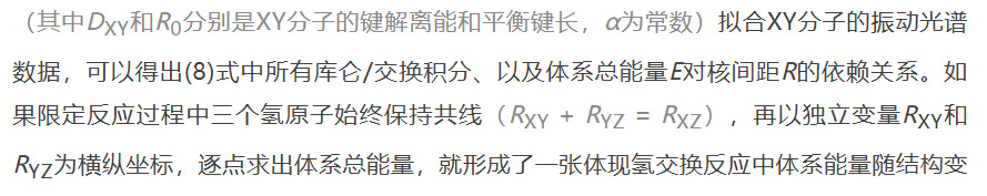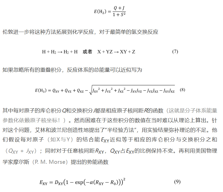 艾林和波兰尼使用的理论工具,是德国物理学家伦敦(F. London)推导出的一种描述多原子体系能量的近似公式。1927年,伦敦和他的同事海特勒(W. Heitler)用氢原子交换电子的方式处理氢气分子结构,指出氢气的基态能量可以用两个氢原子1s电子的库仑积分Q、交换积分J和重叠积分S来表示