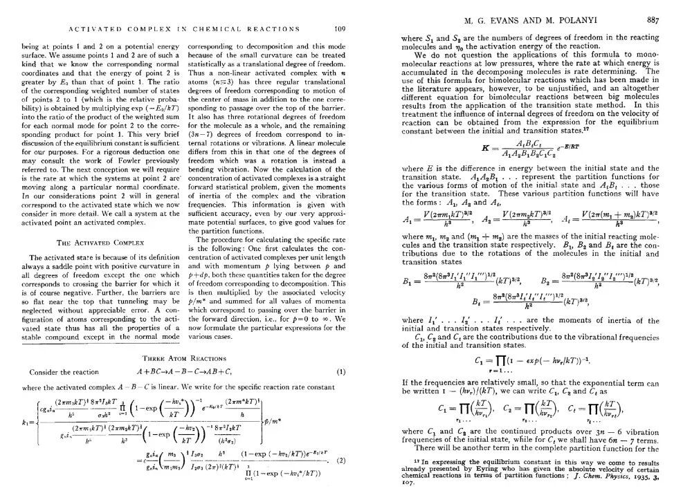 1930年艾林结束访学返回美国,开始在普林斯顿大学任教。1933年纳粹势力在德国掌权,犹太人波兰尼被迫离开,前往英国曼彻斯特大学工作。关于过渡态与反应速率的研究继续在大西洋两岸进行。1935年艾林和波兰尼先后发表了主题相近的论文。他们把统计力学的概念和方法引入化学动力学,建立了完整的过渡态理论(这是波兰尼的术语,艾林称之为绝对速率理论),给出了从分子配分函数出发计算反应速率常数的方案。对于如下双分子反应