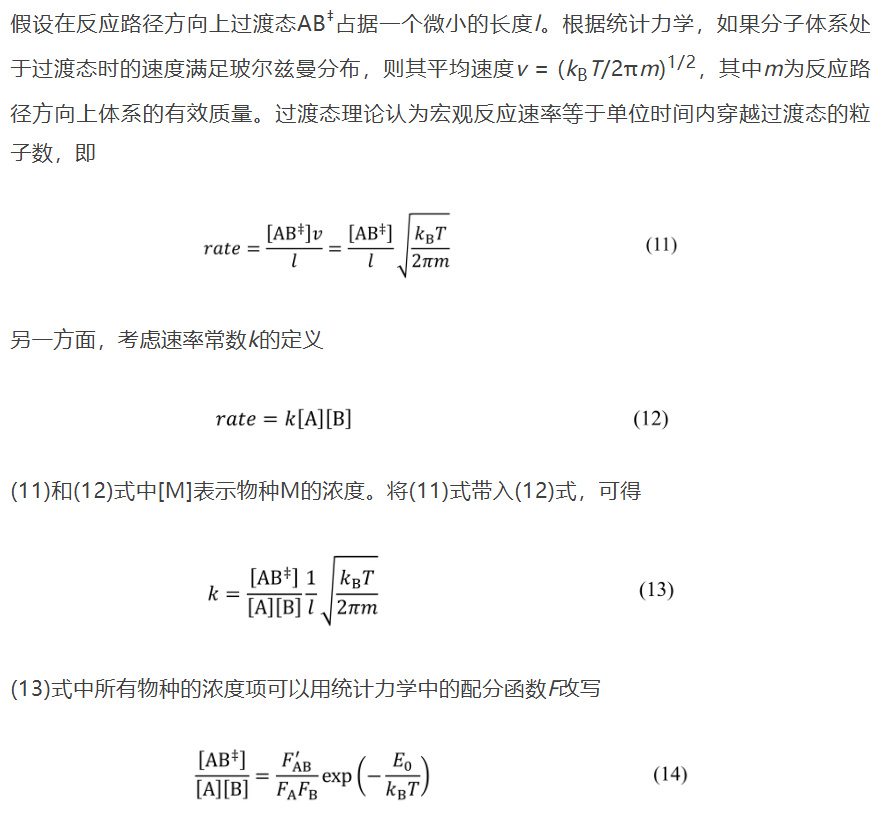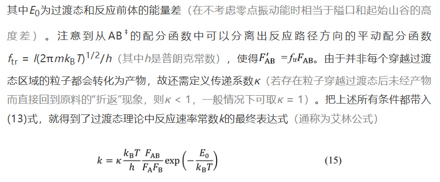 A联系起来。但是,这条平衡假设的有效性成为历来争议的焦点。质疑者认为过渡态寿命极短,其能量并不满足玻尔兹曼分布,因此不会与原料达成真正的化学平衡。赞同者则强调这里的“化学平衡”只是一种数学处理手法,不必苛求其实际意义。值得指出的是,1980年山东大学邓从豪先生证明了,即使放弃过渡态与原料处于化学平衡这一前提(仅假设原料处于热平衡),通过比较严格地求解非定态薛定谔方程,也能推导出(15)式。虽然在绝大多数情况下,仅靠(15)式并不能像艾林期待的那样计算出化学反应的绝对速率,但是过渡态理论在化学学科中的重大意义,是怎样估计都不为过的。因为不论化学动力学后来如何发展,反应速率的基本理论框架都是由(15)式奠定的。物理化学家们也许因此有机会发出狄拉克(P. A. M. Dirac)式的豪言:几乎所有的反应动力学问题,都包括在过渡态理论中了!